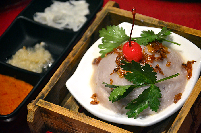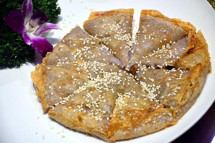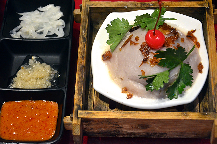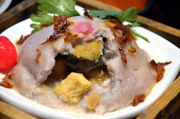 先品尝招牌的芋包大王,芋包的外层用芋泥制成,色泽温润如玉,点缀着殷红的樱桃,美轮美奂。
