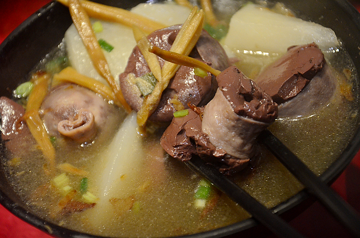 金针大肠血,大肠血是厦门有名的小吃之一,将猪血灌入大肠,经多道工序制成,大肠柔韧猪血细腻,汤汁鲜美,还加入了白萝卜和黄花菜,热乎乎吃上一碗,无比舒畅。
