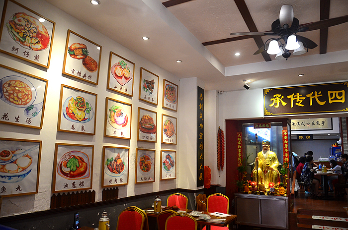 一尊金灿灿的财神,充分体现了厦门民间信仰的盛行,墙上挂着招牌菜的图片,一目了然。