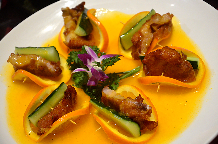 香橙酥肉,酥肉,或者叫海山骨,是厦门大排档中很受欢迎的肉菜,但难免会有些肥腻,这道菜是酒楼的做法,用香橙包裹炸的金黄香酥的带骨三层肉,淋上香橙汁,整块入口,吃起来浓郁的肉香结合酸甜的橙香,好吃还不油腻,拍案叫绝。