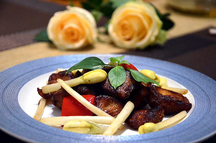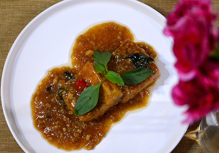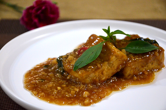 九层塔黄金藜麦豆腐,健身的人都知道藜麦的营养价值,富含人体必需的九种氨基酸,与杏鲍菇一同熬制勾芡后淋在色泽金黄外焦里嫩的豆腐上,看上去晶莹剔透,吃起来豆香浓郁清香美味,回味无穷。
