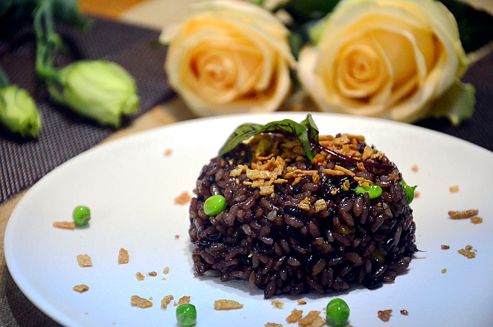 胚芽玉米牛肝菌烩饭,这是睦谷的招牌饭,将野生牛肝菌独家秘法熬制成酱汁,与珍珠米、黑米、糙米、有机胚芽玉米、甜豆粒等杂粮一起翻炒,炒的均匀入味,每一口都营养丰富元气满满,都饱含牛肝菌的香浓。