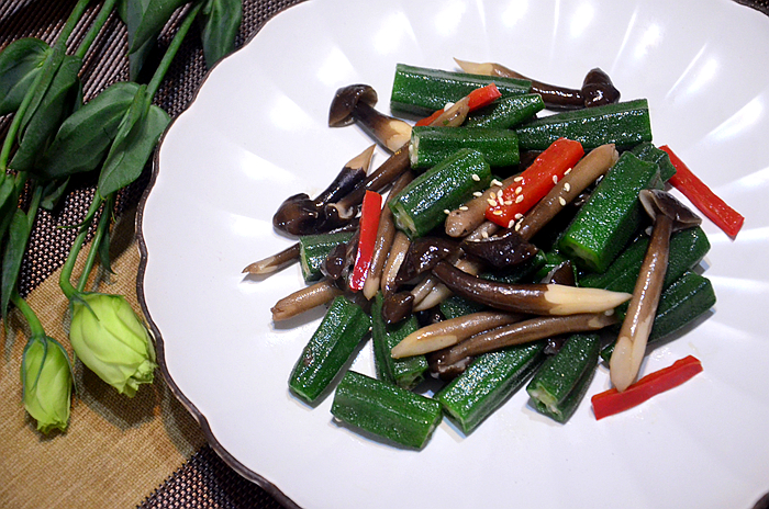 鸡枞清炒秋葵,秋葵和鸡枞的营养价值大家都知道就不多说了,吃起来也是清新爽口,清香扑鼻,一会就瓜分一空。