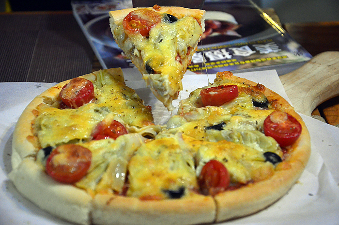 洋蓟披萨,热乎乎的香气四溢,厚厚的饼底蓬松可口,洋蓟和多种水果看上去五颜六色,吃起来滋味丰富,好看好吃又健康。