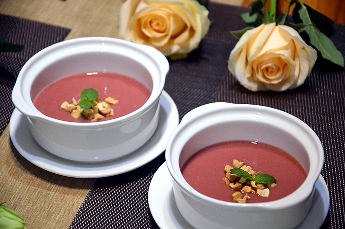 思慕雪,天然的嫣红色泽,用苹果、甜菜根、香蕉、生腰果打制而成,浓郁甜美,芳香柔滑,刮的干干净净,一点都不能浪费。