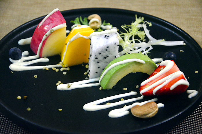 果蔬沙拉,多种水果搭配蔬菜和坚果,摆盘精美五彩缤纷,水果新鲜水灵,芳香甜美,沙拉酱也是纯素的,清新爽口,胃口大开。