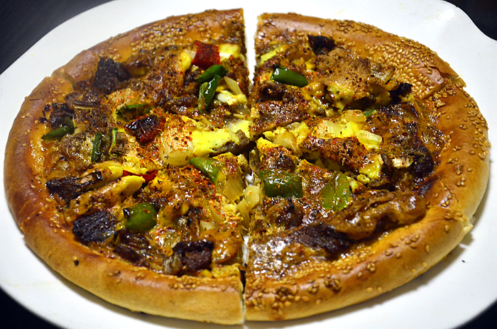 馕披萨,在馕的基础上加上羊肉、蛋等配料,一个美味的馕披萨就完成了,抓起一块大咬一口,馕饼香酥,配料香醇,滋味丰富,吮指回味。