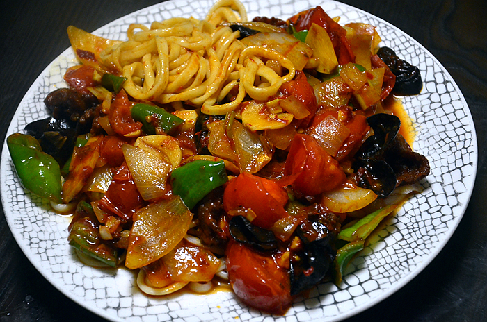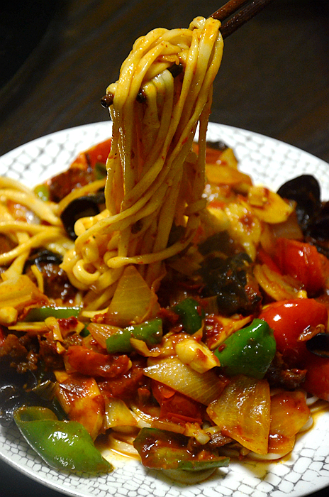 奇台过油肉拌面,色彩艳丽诱人,面条筋道爽滑,弹性十足,配料丰富,滋味可口,很棒的主食。