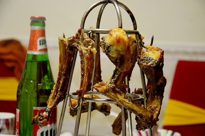 架子肉,把大块的羊排挂在架子上,羊肉色泽焦黄诱人,香气四溢,迫不及待抓起一块送肉口中,肥而不腻,香浓满口,大家赞不绝口。