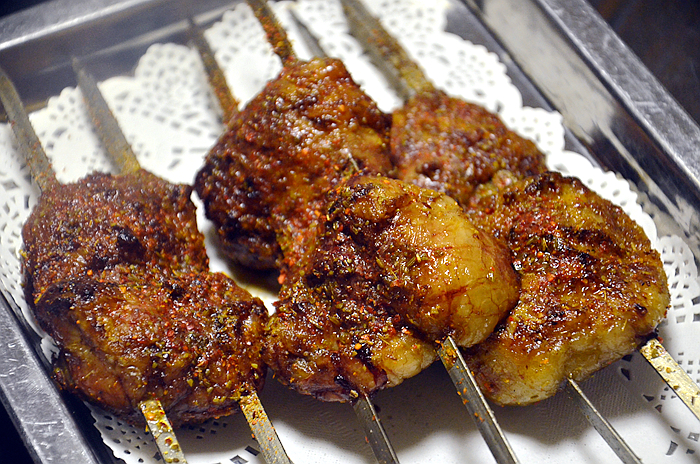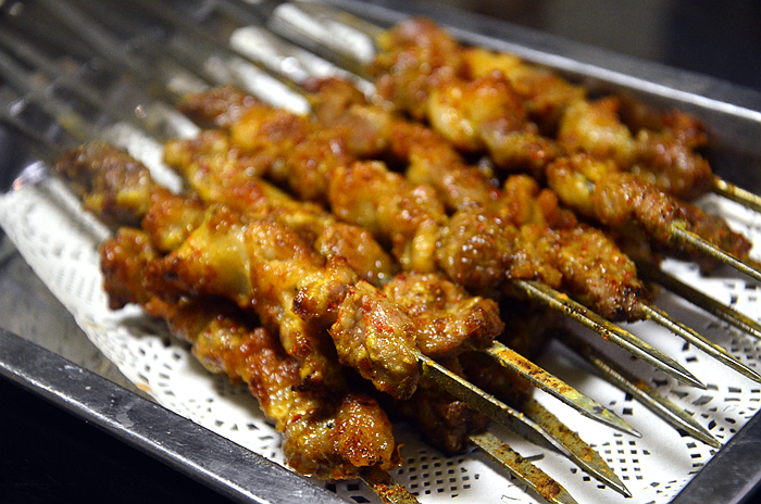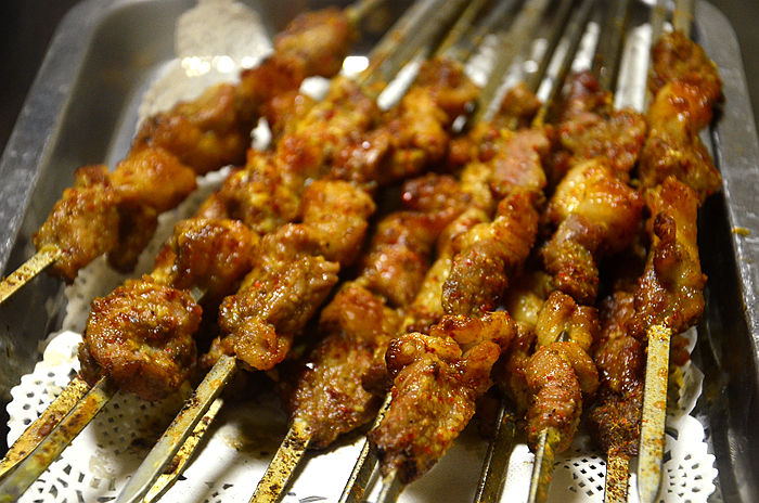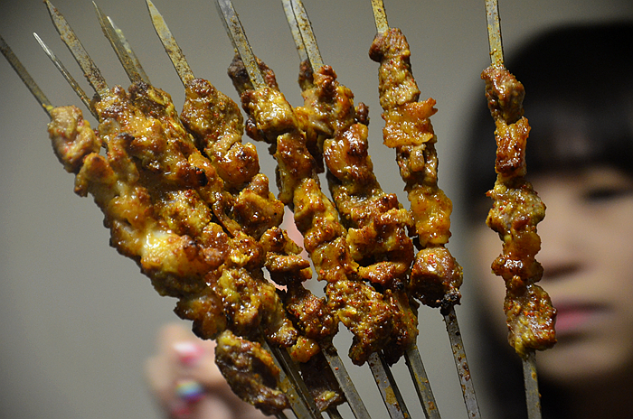 烤羊肉串,新疆的烤羊肉串大名鼎鼎,羊肉大块,肥瘦相间,烤的均匀入味,吃上一块羊肉,喝上一口乌苏啤酒,无比惬意。