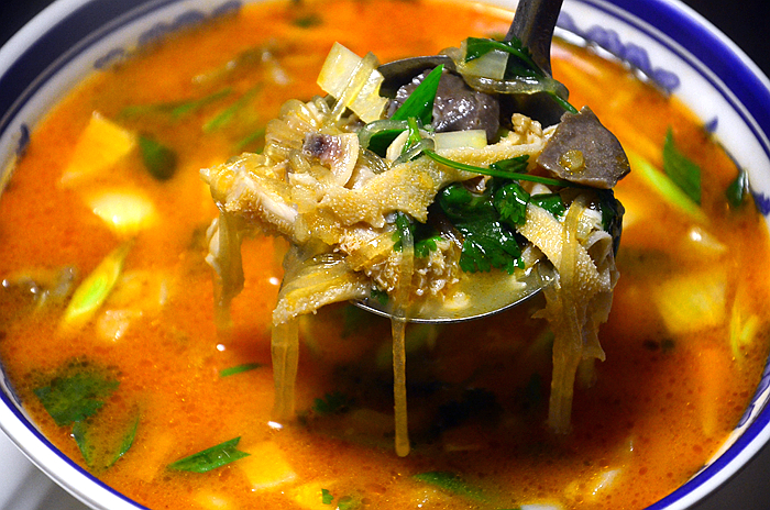 羊杂汤,汤中满满都是羊杂,汤汁香浓酸爽,连料带汤舀上一碗,热乎乎的下肚,浑身舒畅。