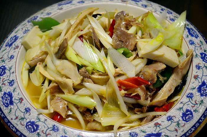 椒麻鸡,鸡肉撕成条状,用秘制配料加上葱、豆腐等配料拌匀,吃起来鸡肉细嫩,麻辣够味,还有葱的清香,回味无穷。