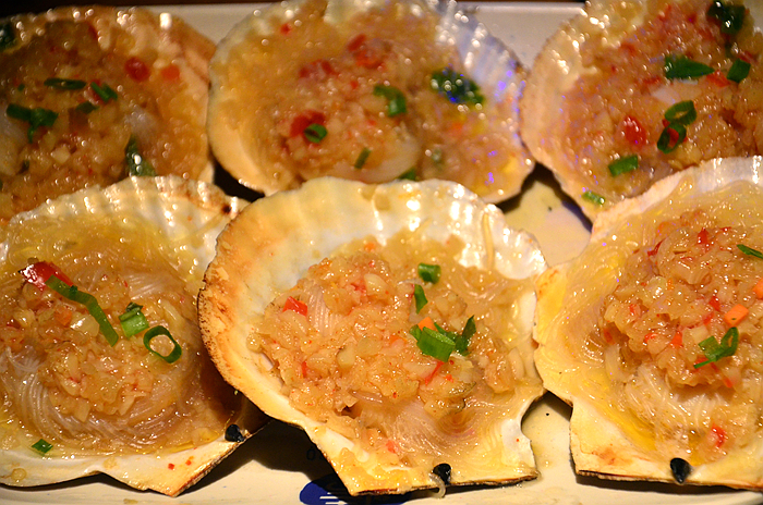 烤扇贝,加入了粉丝跟贝肉一同烤制,贝肉鲜美弹牙,粉丝吸收了鲜美的汁液,连粉丝带扇贝一同送入口中,回味无穷。