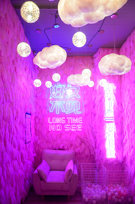 一进门我就被惊呆了,不是酒吧吗,怎么眼前是一个如此美丽的潮拍空间,墙上是粉红柔软的羽毛,天花板上是漂浮着的云朵,老夫的少女心都要融化了,真是女生的拍照圣地,绝对美爆朋友圈。