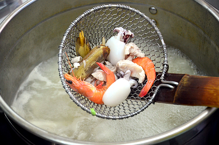 在大骨和花蛤熬制的高汤中把海鲜烫熟,吃的到食材的原汁原味。