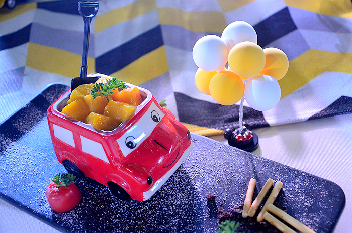 秋小栗慕斯,这是一款很可爱的甜品,容器是卡通拟人的小汽车,慕斯是燕山山脉的秋栗和原产地甄选的纯牛奶凝练而成,滋味香醇,口感细腻,入口即化,搭配健康的水果果肉,自然健康,这么有趣又好吃的甜品,怎能不让孩子喜笑颜开。