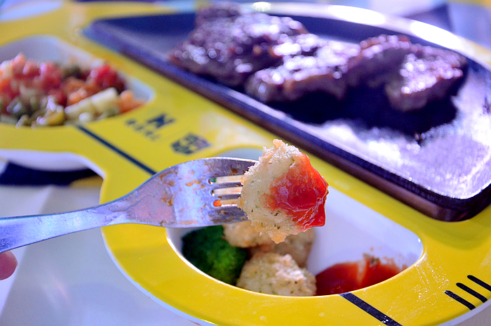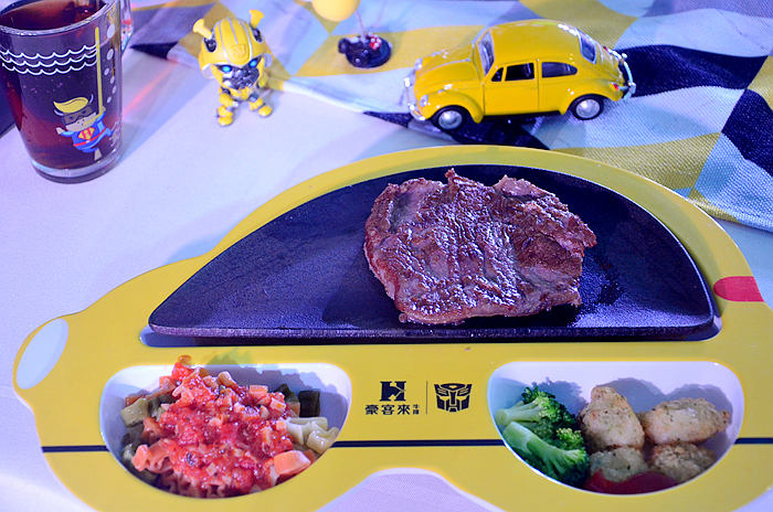 嘟嘟牛排套餐的容器很有趣,是变形金刚的大黄蜂甲壳虫汽车造型,颜色是悦目的黄色,很符合孩子好奇爱玩的天性。