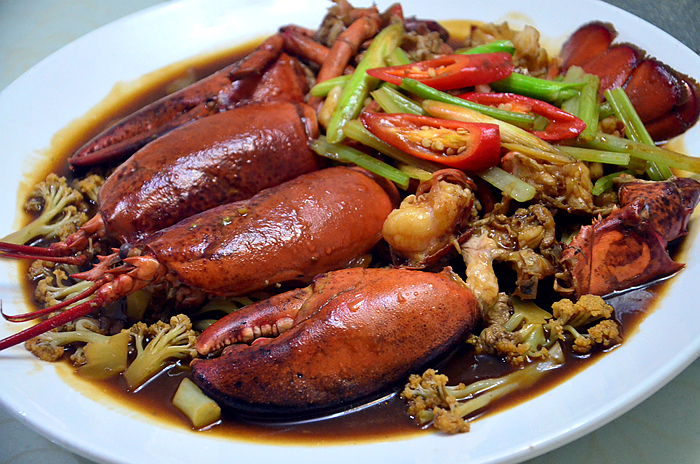 龙虾焖花菜,龙虾色泽通红,肉质饱满弹牙,酱油水的咸香更突显龙虾的鲜美,花菜焖至绵软,吸收了龙虾的滋味,也十分好吃,一定不能错过。