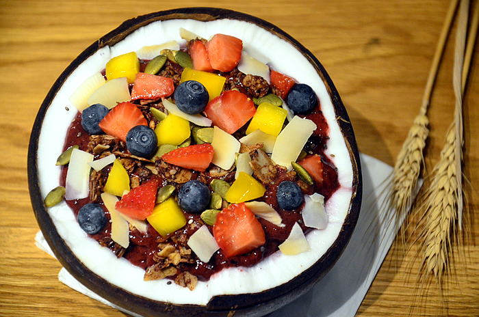 椰子布丁,色彩缤纷美丽,仿佛来到了热带海边,有多种水果、坚果,布丁柔滑酸甜,沁人心脾,很棒的甜品。