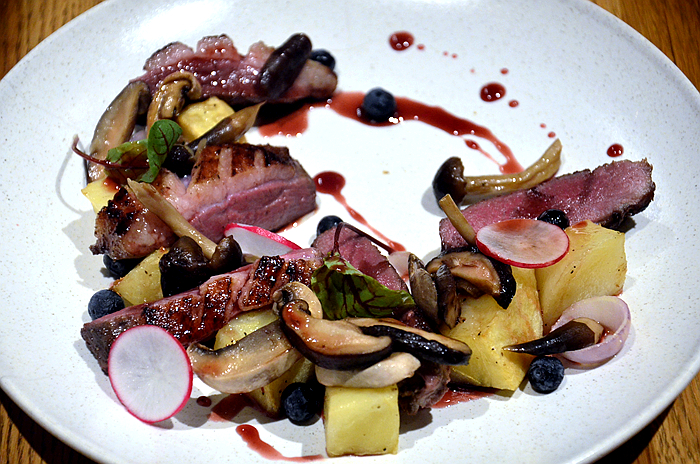 法式鸭胸佐果香红酒酱,摆盘很漂亮,多种食材搭配的乱中有序,鸭胸嫩而有嚼劲,蘸上果香红酒酱吃,更是有滋有味。