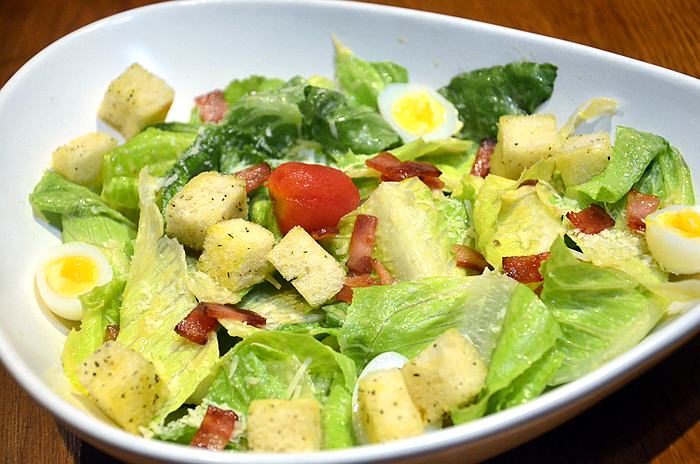 凯撒沙拉,这是款经典的沙拉,蔬菜新鲜水灵,面包香酥可口,鹌鹑蛋娇嫩可人,培根颗粒香浓够味,吃的干干净净还意犹未尽。