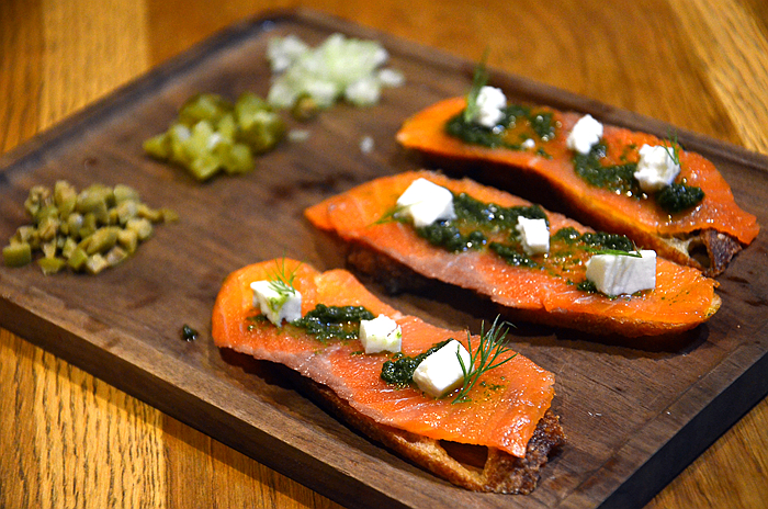 烟熏鲑鱼开胃冷盘,色泽橙红诱人,纹理清晰,口感紧实有嚼劲,鱼肉的鲜美滋味加上烟熏味,让味道层次更丰富,口感味道都很棒,胃口大开。