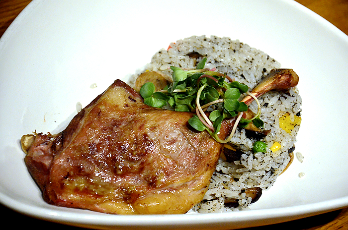 意大利松露菌菇炒饭配油封鸭腿,油封鸭是西餐中很有名的一道菜,鸭腿饱满大个,色泽诱人,烹至软烂,十分入味。炒饭饭粒饱满弹牙,颗粒分明,有丰富的松露和菌菇的清香,很有水准。