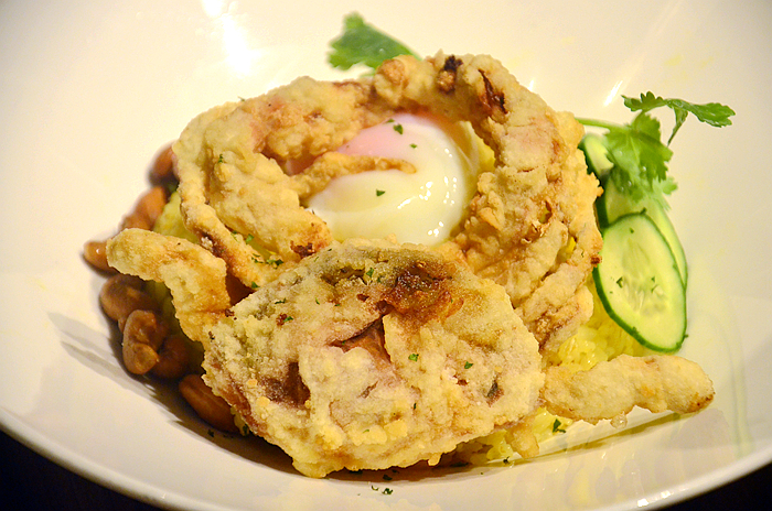 软壳蟹咖喱炒饭,整只的蟹炸至金黄,蟹壳是软的,可以连壳带肉全部吃掉,真是太方便了,香酥鲜美!