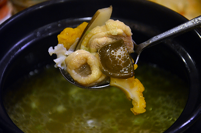菌味四宝汤,娇嫩的鸡肉加上四种滋补养生的菌菇熬制而成,黄澄澄的汤香气四溢,喝起来香浓醇厚,不油不腻,吃料喝汤,十分过瘾。
