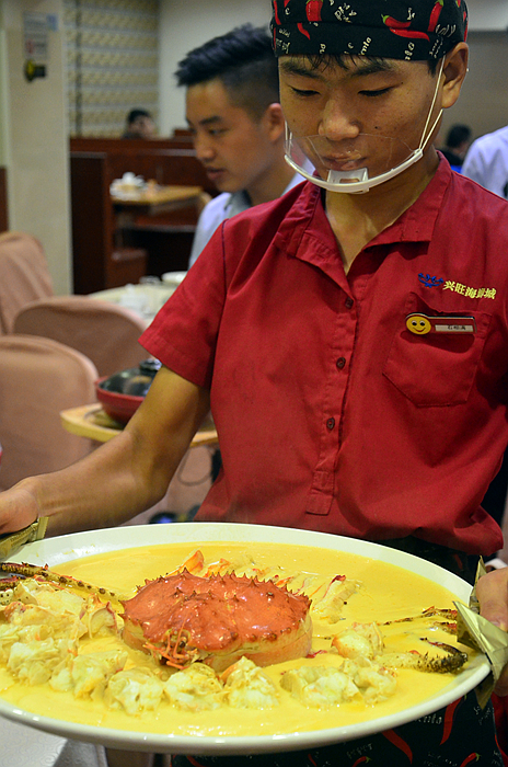 突然大家一阵惊呼,原来是服务员端着一盘巨大的帝王蟹来上菜了!