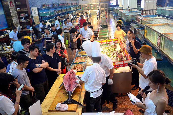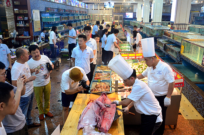 今天和朋友们相约来兴旺海鲜城吃饭,发现正好碰到现切大金枪鱼,这么大的金枪鱼相当难得,自然也价格也相当不菲。
