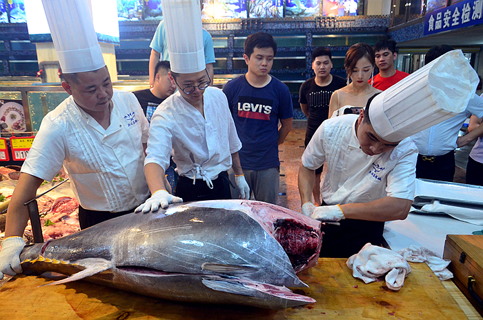 大厨刀工娴熟,庖丁解鱼,有条不紊的把巨大的金枪鱼分切。
