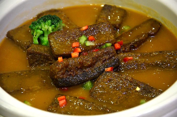 一品芝麻豆腐,豆腐嫩而有弹性,豆香中带着芝麻的清香,烹制入味,很有水准,一会就被大家瓜分一空。