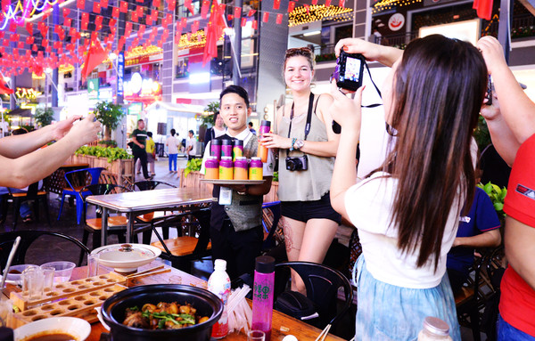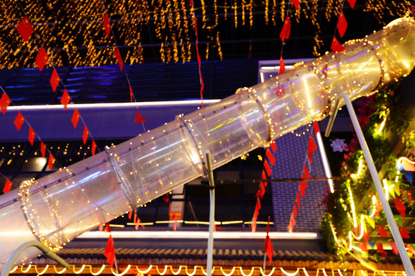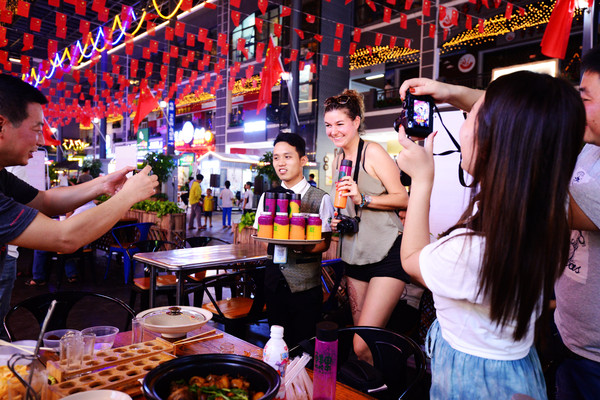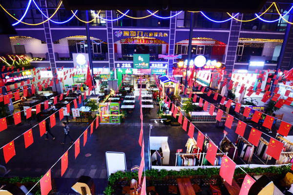 这是一个新兴的夜市,面积很大,店家百余,一、二层全是餐馆、酒吧、咖啡馆,还有影院,吃喝玩乐,一站解决。