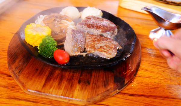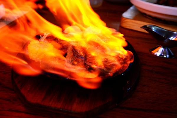 豪约客菜单上有很多款牛排,见我对牛排感兴趣,大厨给我现做了一份火焰牛排,吱吱作响的铁盘端上来,浇上白兰地,点火后窜出蓝色火苗,大伙惊喜的拿出手机录像。