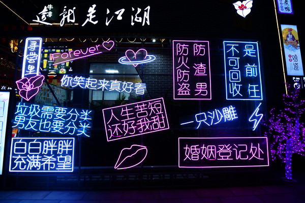 刚走到寻尝里夜市的大门口,就被满墙的文艺的标签圈粉了。