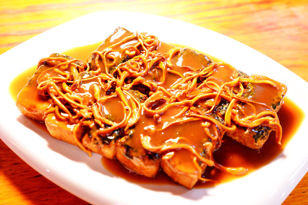 梦龙招牌猪手是黑暗料理,将猪手卤上几天,用秘制的酱汁淋上,颜色金黄透亮,咬上去软乎乎却还有嚼劲,每一口都是天然的胶原蛋白,让我欲罢不能。