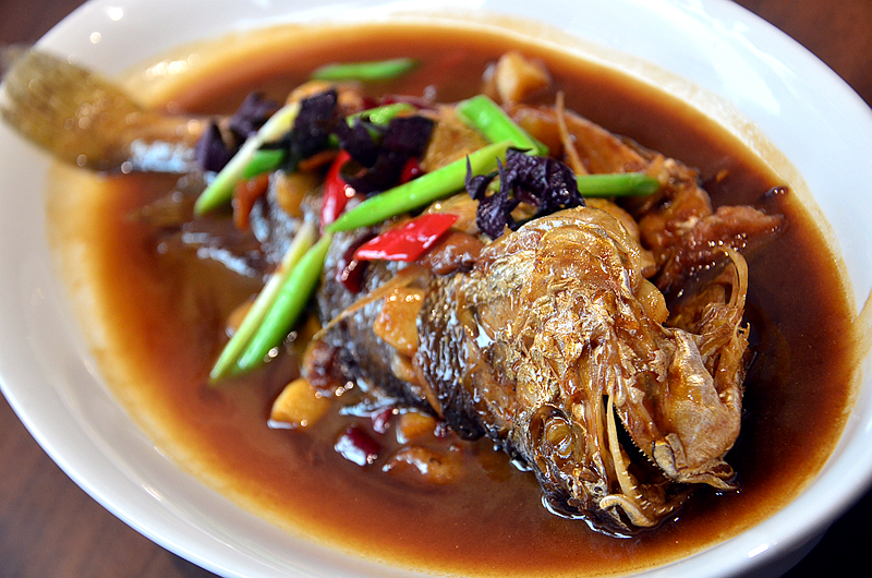 大黄鱼,来自外海半放养的大黄鱼,体型颇大,十分难得,鱼身闪着光泽,新鲜优质,口感细嫩娇柔,鲜美可人,烹制入味,水准一流。