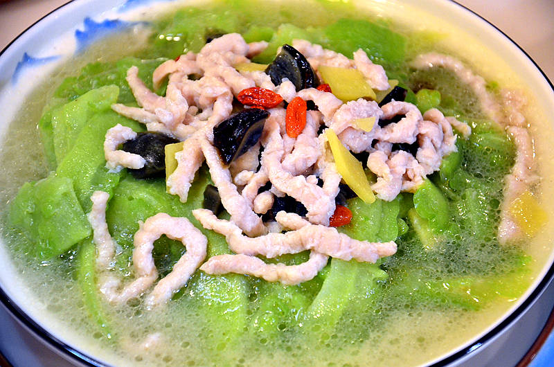 凉瓜浸肉丝皮蛋,色彩清新,赏心悦目,苦瓜清凉微苦,皮蛋清新扑鼻,肉丝丰富可口,汤汁清新滋润,健康养生又好吃。