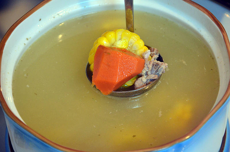 老火靓汤,煲汤是粤菜一绝,用玉米、胡萝卜、排骨熬制,汤汁清爽而不清淡,香醇而不油腻,热乎乎喝上一碗,十分舒畅。