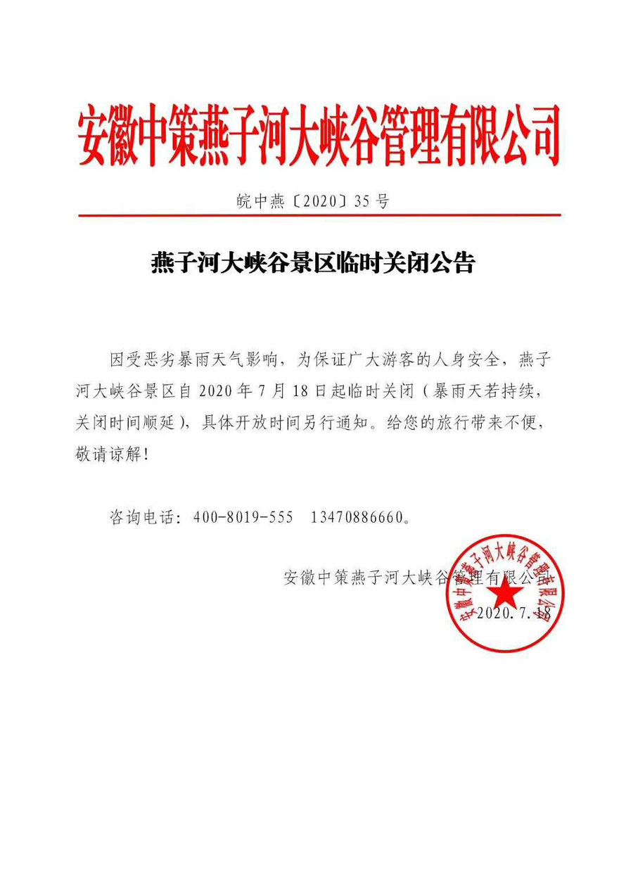 为保证广大游客的人身安全,燕子河大峡谷景区自2020年7月18日起临时关闭(暴雨天若持续,关闭时间顺延)。