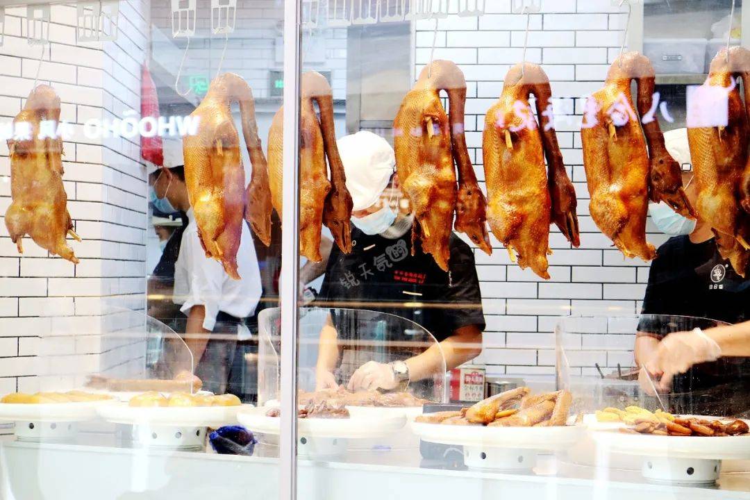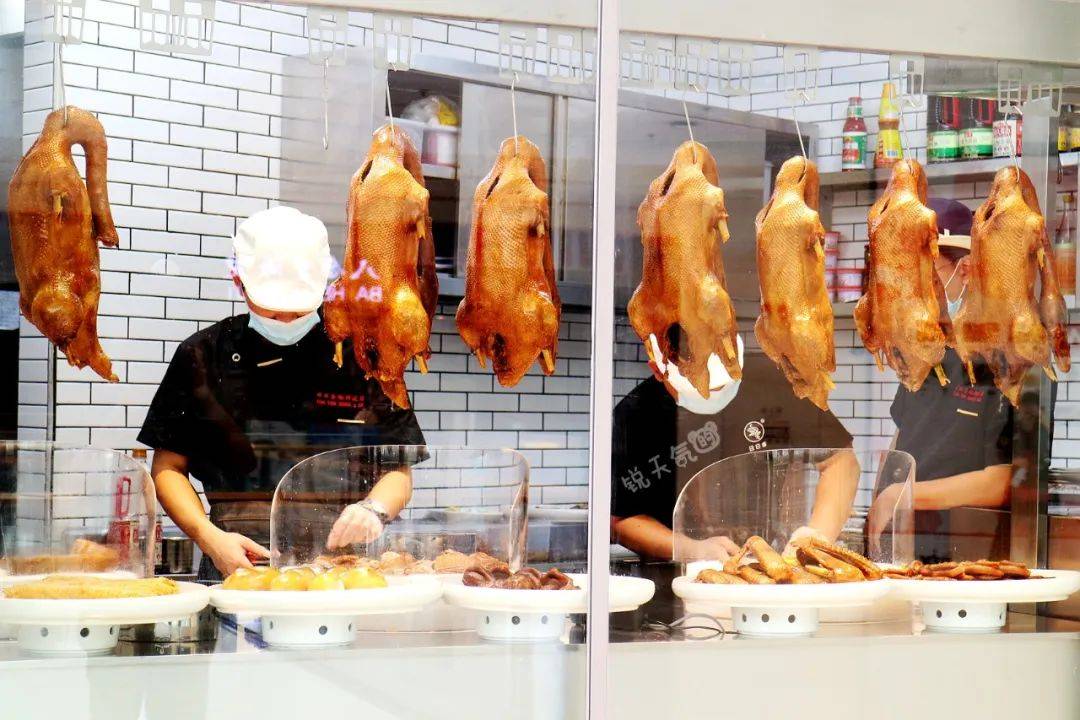 透明玻璃的明档厨房里,悬挂着一只只金黄流油的卤鹅,师傅们正娴熟地切着鹅肉、鹅翅、鹅掌、鹅头、鹅肝、鹅蛋……看得人都要流口水啦!