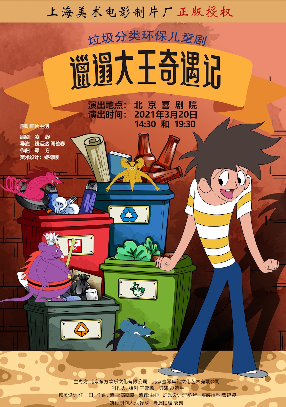 将于2021年3月20日在北京喜剧院上演的《邋遢大王奇遇记》舞台剧,是一部有关垃圾分类的儿童剧。本剧是上海美术电影制片厂授权,由北京壹零年代文化艺术有限公司出品。本剧的主创团队基本上是八零后,主创们希望将自己儿时喜爱的经典动画搬上舞台,并讲述一个全新的故事给现在的孩子。当然,为了向经典致敬,剧中无论是故事情节还是舞美服装道具,都大量使用了动画中的内容。因此,家长们可以在陪孩子看剧的同时,拾起童年的记忆。