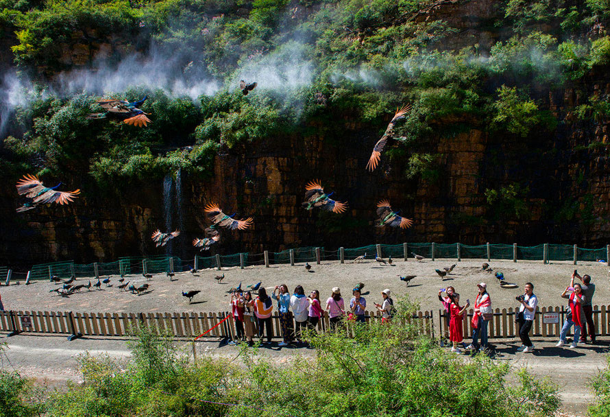 孔雀乃百鸟之王,为吉祥、富贵和百年好合的象征。每到上午11点和下午3点孔雀放飞的时刻,众多游客常常会早早等候在山脚下围观,那近千只孔雀从悬崖洞穴凌空而出,在山涧飞舞,它们或降落在对面的山崖,或散步于溪水岸边,引得游客惊喜尖叫,小孩子们会兴奋地大喊“孔雀孔雀”,场面热闹而欢乐。