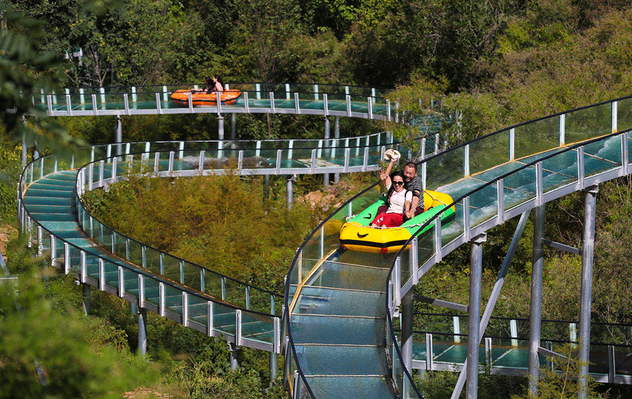 漂流的滑道层层盘旋在峡谷崖璧,游客坐的皮艇里,顺流而下,峡谷山涧的美景在两侧次第闪过,节省了下山的体力,欣赏了峡谷的美景,又体验了玻璃水滑的魅力。这两种滑道都是从高山上俯冲而下,犹如过山车般有惊无险,还不湿身。