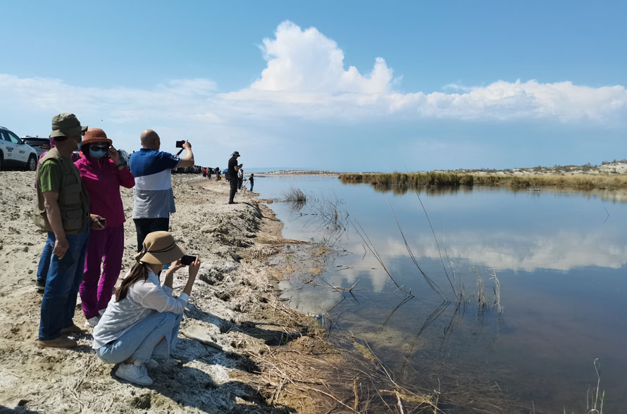自驾游团游客们一到公路旁边的木栈道上,就拿出相机,手机,不停地拍照留影,由衷地感叹,在大漠之中,竟有这么一泓碧水,在这里不仅能欣赏到神奇的大漠风情、更能领略到美丽的滨海风光,壮观的湿地景观。