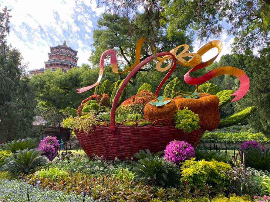 “祝福”花坛位于颐和园国花台,以中国传统吉祥花篮造型为主体构架,采用牡丹、寿桃、桂花、柿子等具有传统吉祥寓意的元素组合在一起,融入颐和园皇家园林环境,祝福党的百年华诞,祝福人民生活幸福美好。
