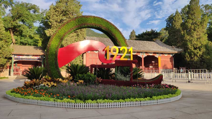 香山公园东门的南、北两组花坛名为“光辉历程”,分别以“红船、红亭、红叶”为元素,表现中国共产党成立100年来的光辉奋斗历程,歌颂一代代中国共产党人肩负起实现中华民族伟大复兴的历史使命,团结带领人民进行艰苦卓绝的奋斗,谱写了气吞山河的壮丽史诗。