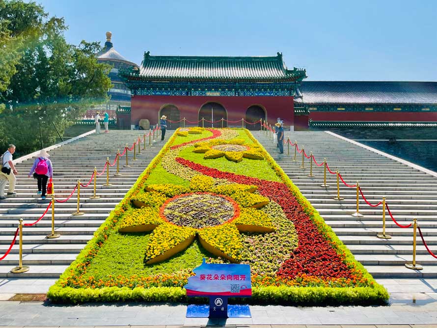 天坛公园“葵花朵朵向阳开”花坛位于祈年殿西下坡,以葵花、飘带为元素,画面中朵朵葵花向阳盛放,象征着欣欣向荣,万众一心,祝福党的生日。
