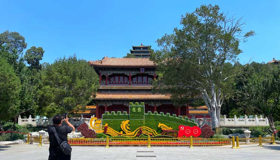 围绕“党的生日,人民的节日”主题,北京市属公园及中国园林博物馆在主要门区、重点景区、重要景观节点等区域的花坛环境设计中,进一步挖掘环境布置的新元素、新手法,着力突出红色元素和祝福意义